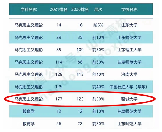 2021年10月25日,高等教育评价专业机构软科正式发布“2021软科中国最好学科排名”,我校马克思主义理论学科上榜,在所有设有学术型研究生学位授权点的高校中名列前50%,排名位列第177位,山东高校第7位。