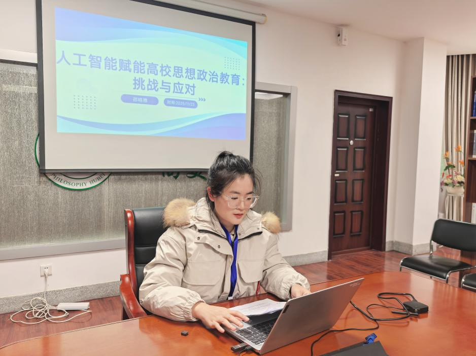 在分论坛中,参会代表围绕人工智能的技术伦理、政治伦理、教育变革、文化价值等数个议题开展50余场报告。我院邵晓雅同学在分论坛中作《人工智能赋能高校思想政治教育:挑战与应对》主题发言。
