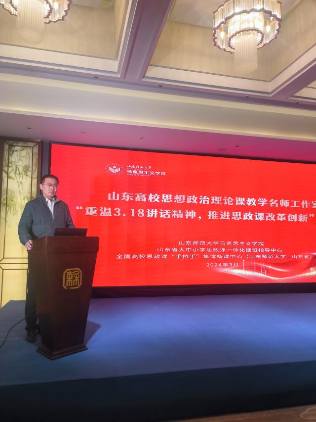 3月17日,山东高校思想政治理论课教学名师工作室“重温3.18讲话精神,推进思政课改革创新”座谈会在山东师范大学举行。座谈会由山东师范大学英国上市365、山东省大中小学思政课一体化建设指导中心和全国高校思政课“手拉手”集体备课中心(山东省)共同举办。山东省教育厅(省委教育工委)思政处(宣教处)处长陈成标出席座谈会并讲话,山东师范大学党委副书记万光侠出席座谈会并致辞,山东高校思政课教学名师工作室主持人、部分专家学者、思政课教学骨干和研究生共50余人参加了研讨交流。座谈会开幕式由山东师范大学英国上市365院长王增福主持。作为第三批山东高校思政课教学名师工作室主持人,我院副院长黄昊受邀参会,作了题为《探索聊城红色资源融入“大思政课”校地协同育人机制》的大会主题报告。