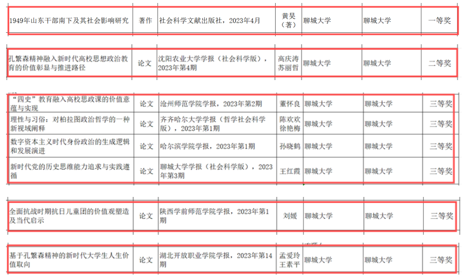 近日,聊城市社会科学优秀成果评选委员会公布了聊城市第三十届社会科学优秀成果名单,我院8项成果获奖,获奖数量创近年来新高。其中黄昊的《1949年山东干部南下及其社会影响研究》获得一等奖,高庆涛与苏丽哲的《孔繁森精神融入新时代高校思想政治教育的价值彰显与推进路径》获得二等奖,董怀良的《“四史”教育融入高校思政课的价值意蕴与实现》、陈欢欢与徐艳梅的《理性与习俗:对柏拉图政治哲学的一种新视域阐释》、孙晓鹤的《数字资本主义时代身份政治的生成逻辑和发展演进》、王红霞的《新时代党的历史思维能力追求与实践遵循》、刘媛的《全面抗战时期抗日儿童团的价值观塑造及当代启示》、孟爱玲与王素平的《基于孔繁森精神的新时代大学生人生价值取向》获得三等奖。