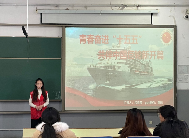宣讲团成员吕喜梦以“中国号”巨轮航海之旅为隐喻,带领同学们回望“十四五”时期国家在经济、科技、民生尤其是教育领域的成就,用“重庆背篓专线” 等案例让大家直观感受发展温度。随后紧扣全会核心,解读“十五五”规划中教育相关部署,剖析“建设教育强国”与“推进中国式现代化”的关联,明确教育类专业学生的责任方向。