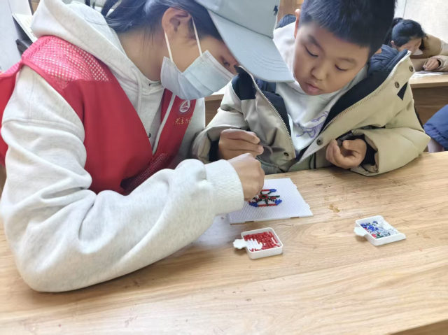 活动现场,主讲老师向孩子们系统讲解了藻井的历史渊源、建筑功能与文化寓意,介绍藻井是中国古代建筑中屋顶装饰的重要组成部分,并详细阐释了“藻井避火”的象征含义。手工体验环节,志愿者们耐心讲解藻井纹样构图,引导孩子们逐步完成拼豆制作。孩子们积极交流配色创意,并主动分享自己的创作思路,展现出对非遗文化的实践热情。