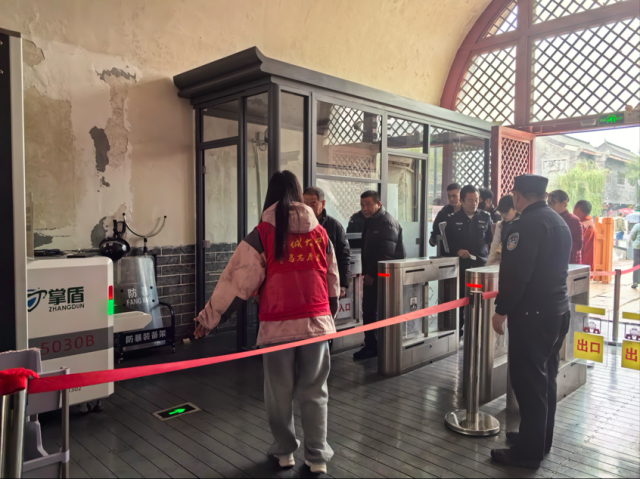 活动当天,志愿者们身着统一马甲,迅速投入工作岗位,围绕游客需求开展高效、细致的服务。服务引导组为往来游客提供方向指引、购票协助及文创产品介绍等暖心服务;安全引导组主动照亮台阶与通道,确保游客在游览过程中安全顺畅;秩序维护组则驻守于人流密集区域,保障现场活动井然有序。