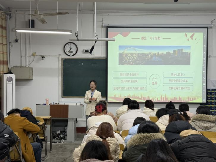 范莹莹首先带领同学们系统回顾近五年国家取得的辉煌成就,以案例筑牢理论认知根基。随后,她围绕党的二十届四中全会的核心要义与历史定位展开深入解读,结合青年成长实际,对“十五五”规划核心目标与“六个坚持”原则进行分层剖析,清晰阐释了国家发展蓝图与青年个人成长的内在逻辑关联。