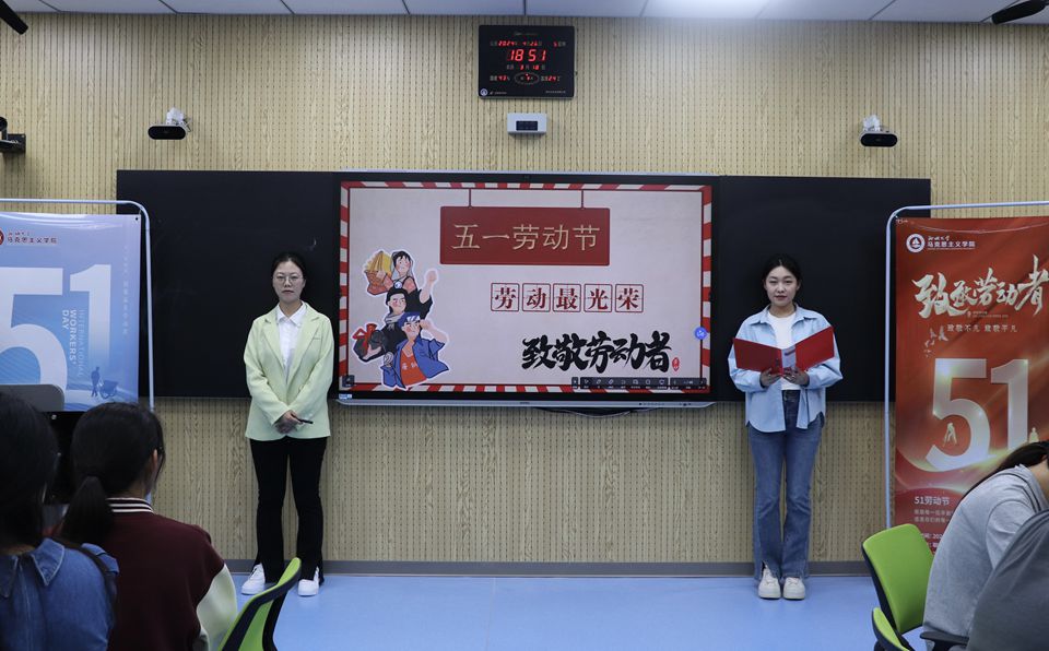 4月26日,我院开展第十二期思政年历微思政课交互体验活动——五一国际劳动节,习近平新时代中国特色社会主义思想青年学习会骨干成员钟翠、张雨担任主讲人。