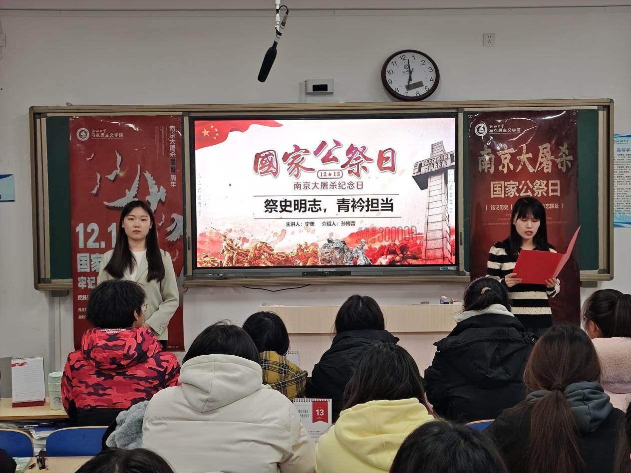 12月10日,我院开展第二十四期思政年历微思政课交互体验活动——南京大屠杀死难者国家公祭日,习近平新时代中国特色社会主义思想青年学习会骨干成员宁美 、孙博蕾担任主讲人。