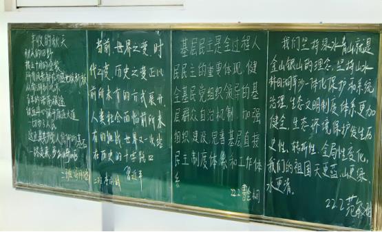 一支粉笔书芳华,一块板书展风采,写好黑板字是每位师范生必备的基本技能之一。在训练过程中,同学们自选题材,可以是与专业有关的学科知识,可以是各类诗歌,也可以是经典的篇章语段。同学们全神贯注,在黑板上一笔一划精心书写着,力求做到书写规范,结构合理,布局美观。他们所写的粉笔字,有的飘逸舒展、有的洒脱大气、有的大方得体……一幅幅作品不仅体现出了他们的书写功底,而且展现了当代大学生蓬勃向上的精神面貌。此次活动能够引导同学们通过练习粉笔字,以点带面,实现以小黑板带动大教学。