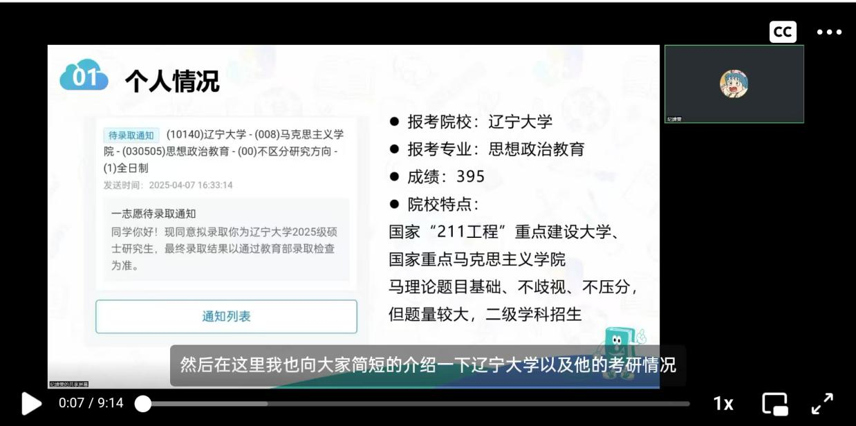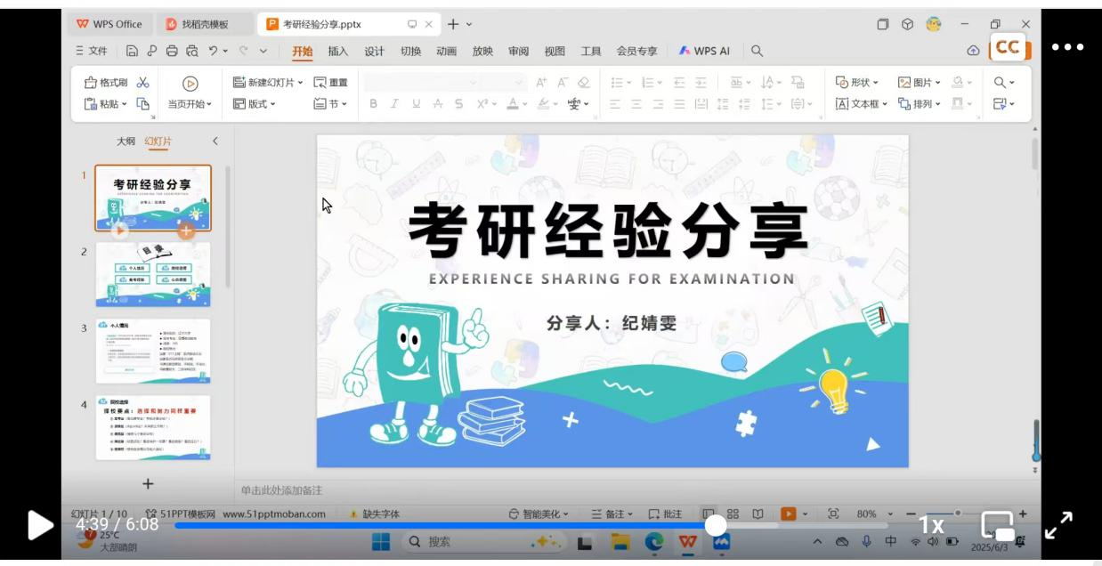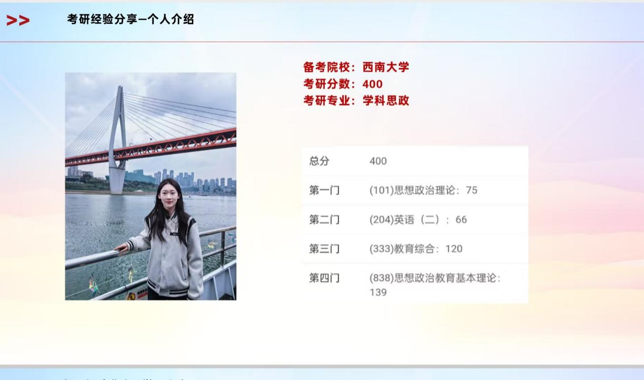 张钰淇围绕学科思政专业备考策略进行分享。针对英语学习,她向同学们分享了“词汇积累+真题研习”的科学方法,推荐了“万词王”APP、《考研红宝书》等相关学习资源;在专业课备考方面,她着重指出要把握核心科目,通过多轮复习逐步夯实基础、深化理解与记忆,为备考该专业的同学提供了清晰地学习路径。