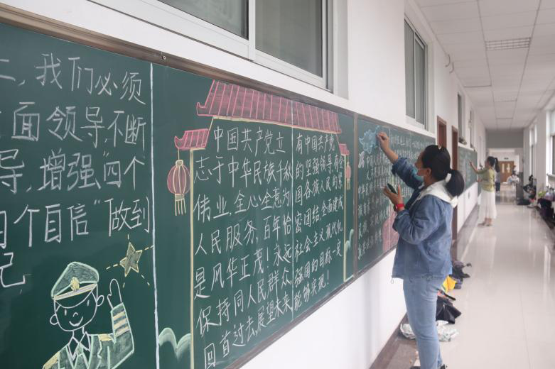 “方寸显智慧,板书展功底。”同学们一起学习、讨论习近平总书记“七一”重要讲话精神,习近平总书记的重要讲话立意高远、思想深邃,鼓舞人心、催人奋进,同学们深刻认识到“未来属于青年、希望寄予青年”的深刻内涵,这为活动的顺利开展打下坚实思想基础。活动现场,陈萌萌和张钰琪等同学积极参与,利用图文结合的形式进行板书书写和绘制。同学们热情高涨,积极参与,主动出谋划策,在黑板上留下一个又一个精彩的创意。主持人对所有板书做最后总结,并对板书设计进行了分析,指出了板书设计需要有计划性和针对性,既要提前布局设计好每一部分的作用,充分有效地利用黑板面积;还要做到重点突出,有鲜明性,详略得当。