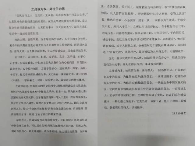 活动围绕“诚信在人间不可缺少”的主题展开,要求参与者进行有关诚信的征文创作。同学们用真挚流畅的语言书写对诚信的独特见解,深刻体会和感悟“诚信”在生活中重要性,唤醒自我教育和自我完善的认识,自觉加强诚信建设,在潜移默化中养成诚信待人、诚信处事、诚信立身的良好习惯。同学们的文章主题鲜明,结构层层递进,文学底蕴深厚,情感浓烈真挚,全面深刻地体现了诚信的意义。2022级2班孙菁艺就大学生诚信教育目的与活动内容进行解读,指出了诚信对个人、集体、社会以及国家等多个层面的重要意义,内容生动富有深度,呼吁同学们进一步理解诚信的基本内涵,提高征信意识、金融意识、风险意识、法律意识,增强当代大学生的责任感,树立正确的消费观、荣辱观和价值观。