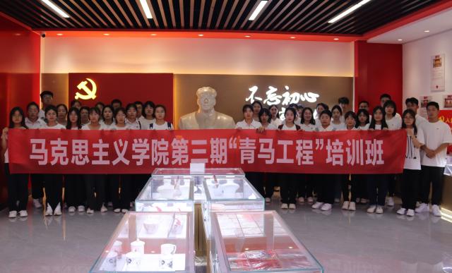 在王峰的带领下,青马学员们走进展厅,共同参观展厅内陈列收藏的各种红色藏品,包括各种翻译版本《共产党宣言》、毛主席像章、纪念章、瓷器、文献史料、照片等,通过史料重温建党百年的光辉历程。王峰谈到,这些藏品从侧面反映了我党我军的革命史、奋斗史、发展史,展现了在漫长的艰苦奋斗的岁月里,革命先辈前赴后继,为民族解放事业立下的不朽功勋。