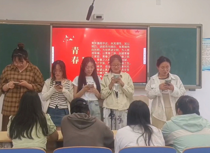 结合影像资料,团支部书记宋佳琦生动讲解了中国青年运动的发展历史。她谈到,从五四运动的勇敢呐喊,到抗日战争的浴血奋战,再到改革开放的开拓创新,中国青年始终用实际行动诠释着担当意识、责任意识和奉献精神,以青春之我创造青春之中国。在深入学习习近平总书记关于新时代青年工作的重要论述后,宋佳琦进一步指出,团支部成员要坚持以习近平新时代中国特色社会主义思想为指导,深刻把握当代青年历史使命,发扬青年人的担当精神和奉献精神,以青春之我书写时代篇章。为展现学习成果,同学们通过诗歌朗诵、红歌献唱等多种形式进行了综合性展演。其中,李大钊的青春诗歌以其浓烈的爱国主义情怀和舍我其谁的英雄气概,流露出青年们对祖国的深厚情感;歌曲《我和我的祖国》则展现了他们的民族自信心与自豪感。此外,同学们还分享了新时代青年在乡村振兴、脱贫攻坚、科技发展等领域中涌现出的英雄事迹,传递出积极向上的价值观,展现了新时代青年的风采和担当。