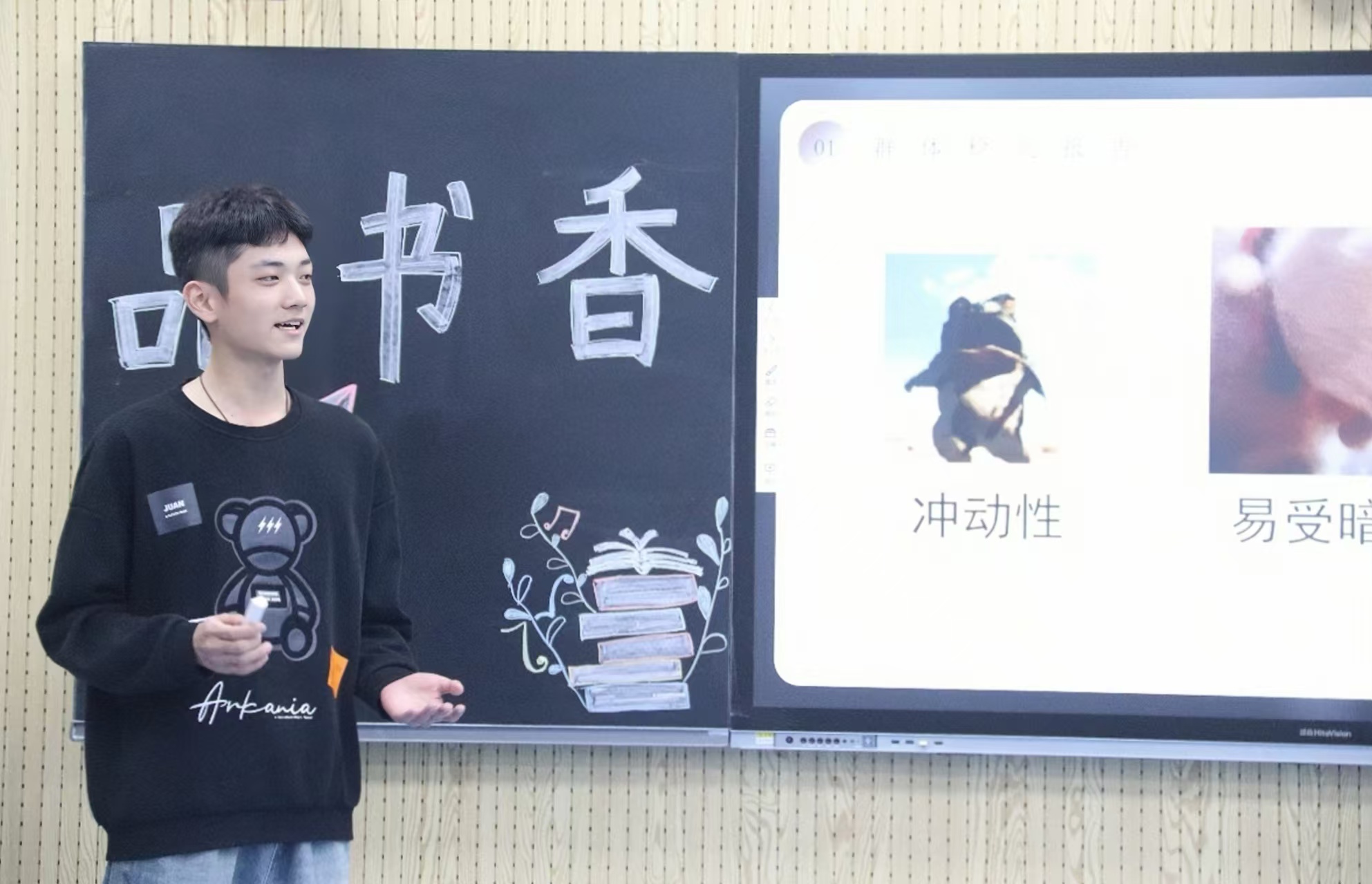 活动以《乌合之众》为阅读书目,紧扣书中"群体心理与清醒认知"主题,通过情境模拟、互动测试等生动形式,带领同学们探索如何在群体中保持独立思考能力。活动现场,李一鸣同学以日常生活中常见现象为切入点,深入剖析群体冲动性、易受暗示性及极端化倾向等心理特点。针对网络空间的匿名环境,现场设置“匿名攻击测试”环节,以情境式体验让同学们真切感受到虚拟空间中"法不责众"的心理效应,引发对网络言论责任的深刻反思。