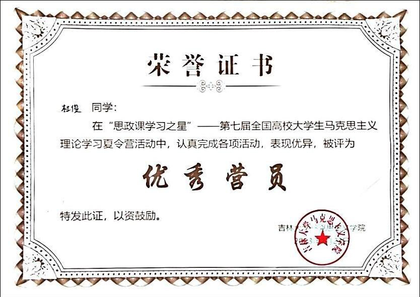 为深入贯彻落实习近平总书记关于“大思政课”的重要指示批示精神,充分发挥高校思政课立德树人关键课程作用,引导学生在“大思政课”中受教育、长才干、做贡献,在教育部社科司指导下,吉林大学英国上市365于7月19日至23日成功举办“思政课学习之星”——第七届全国高校大学生马克思主义理论学习夏令营活动,我院2021级思想政治教育专业本科生杜俊荣获参营资格并获评“优秀营员”称号。
