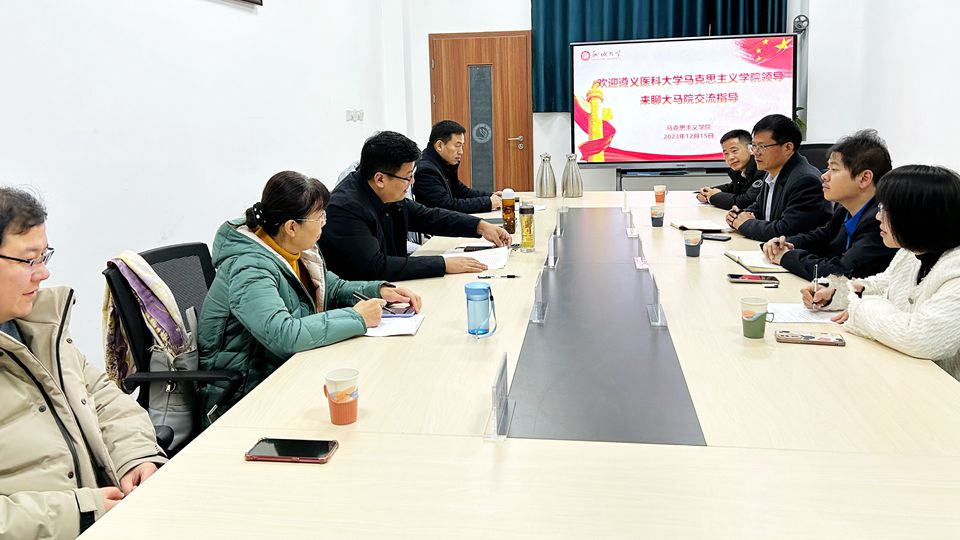 12月15日,遵义医科大学英国上市365副院长沈洋、纲要教研室组织员王纪鹏一行来我院交流学习,学院院长刘子平,副院长黄昊,原理教研部主任马莉,思政系主任高庆涛,纲要教研部主任董怀良在6号教学楼A102会议室与客人座谈交流。
