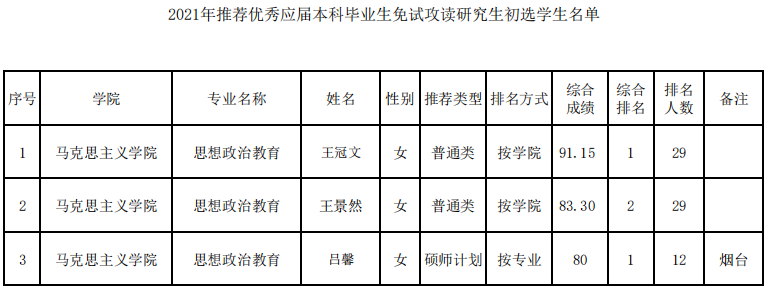 2021年推荐优秀应届本科毕业生免试攻读研究生初选学生名单