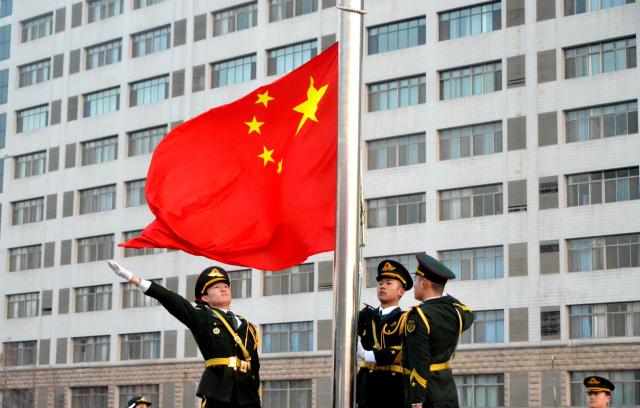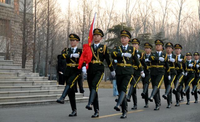 7时,英姿飒爽的国旗护卫队踏着坚毅整齐的步伐正步而出,护送鲜艳的五星红旗入场。伴随着激昂雄壮的《义勇军进行曲》,五星红旗冉冉升起,在场师生怀着崇敬的心情向国旗行注目礼,齐声高唱国歌。