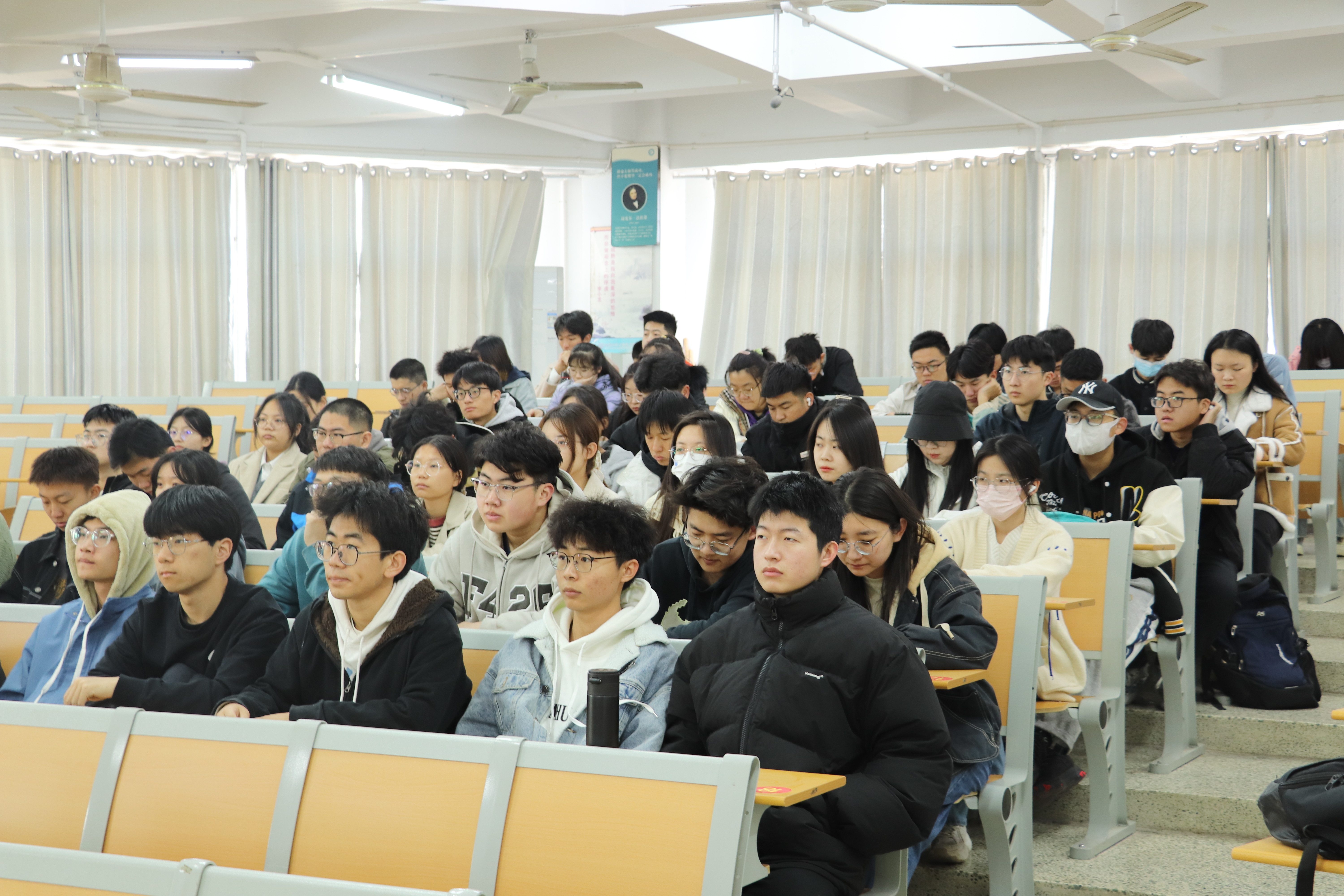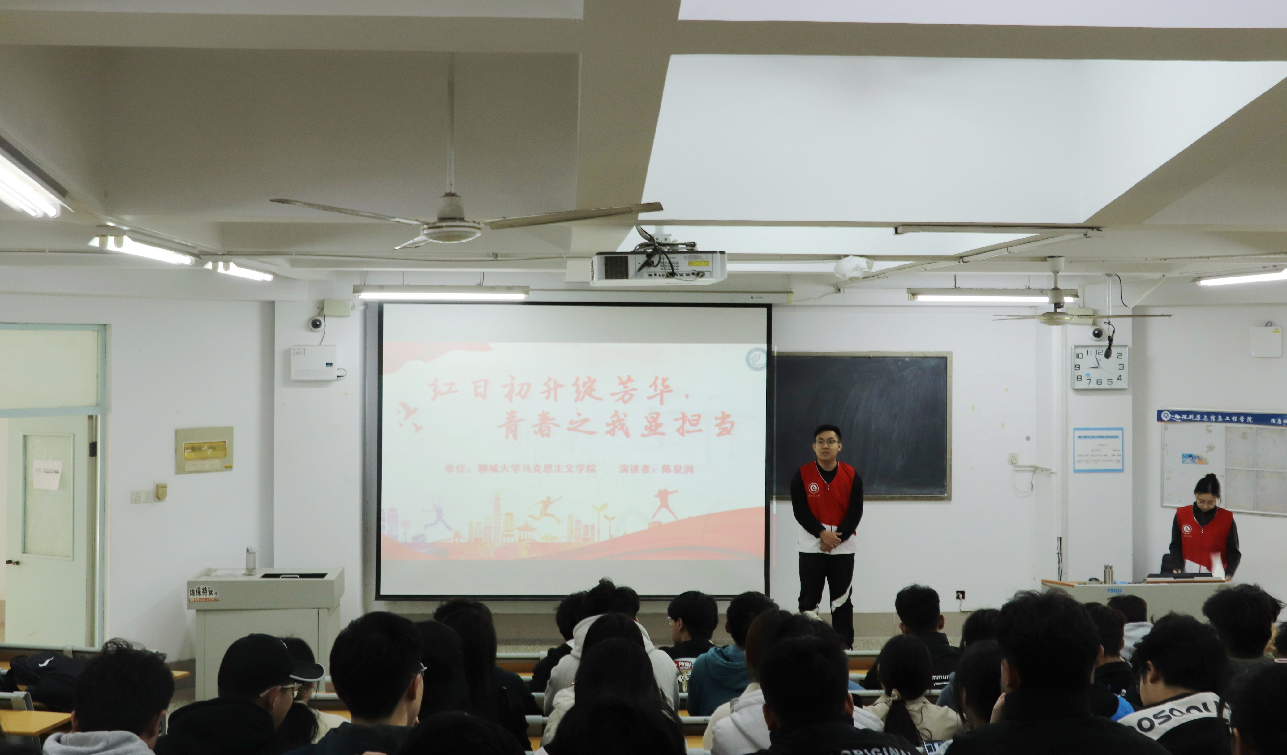 3月12日,我院青年大学生时政宣讲团成员陈泉润、梁馨元在知行楼504室作了题为《红日初升绽芳华,青春之我显担当》的宣讲。物理科学与信息工程学院2022级学生代表参加此次宣讲会。