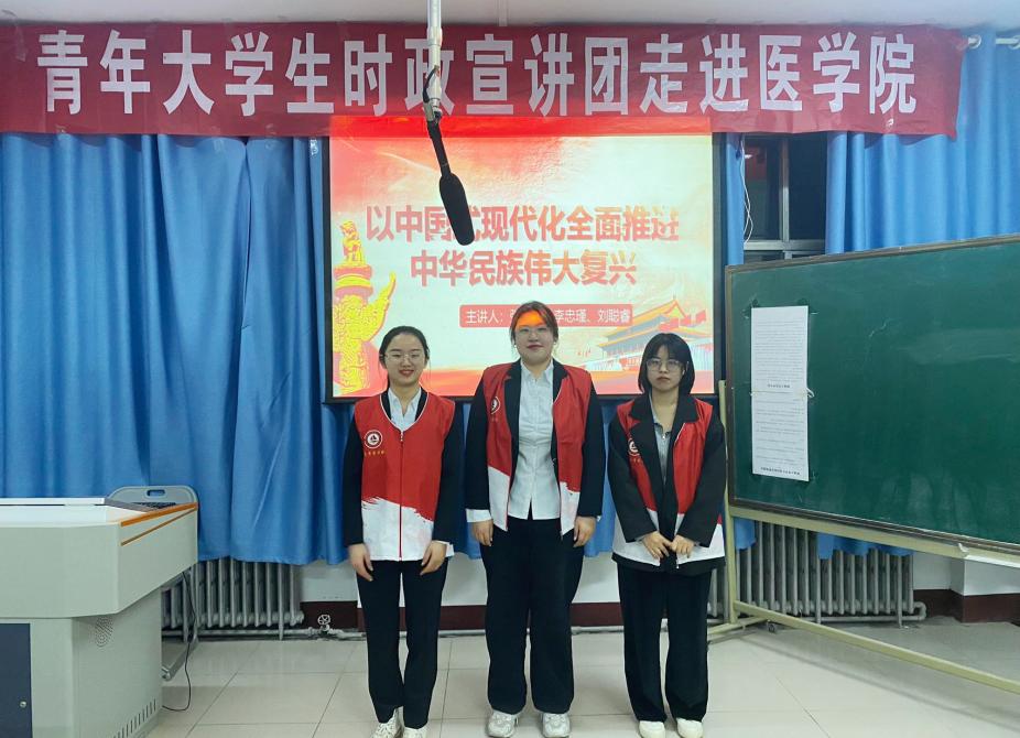 3月24日,我院青年大学生时政宣讲团成员张艳蕊、李忠瑾、刘聪睿在1号办公楼315室作了题为《以中国式现代化全面推进中华民族伟大复兴》的宣讲。医学院2022级学生代表参加了本次宣讲会。