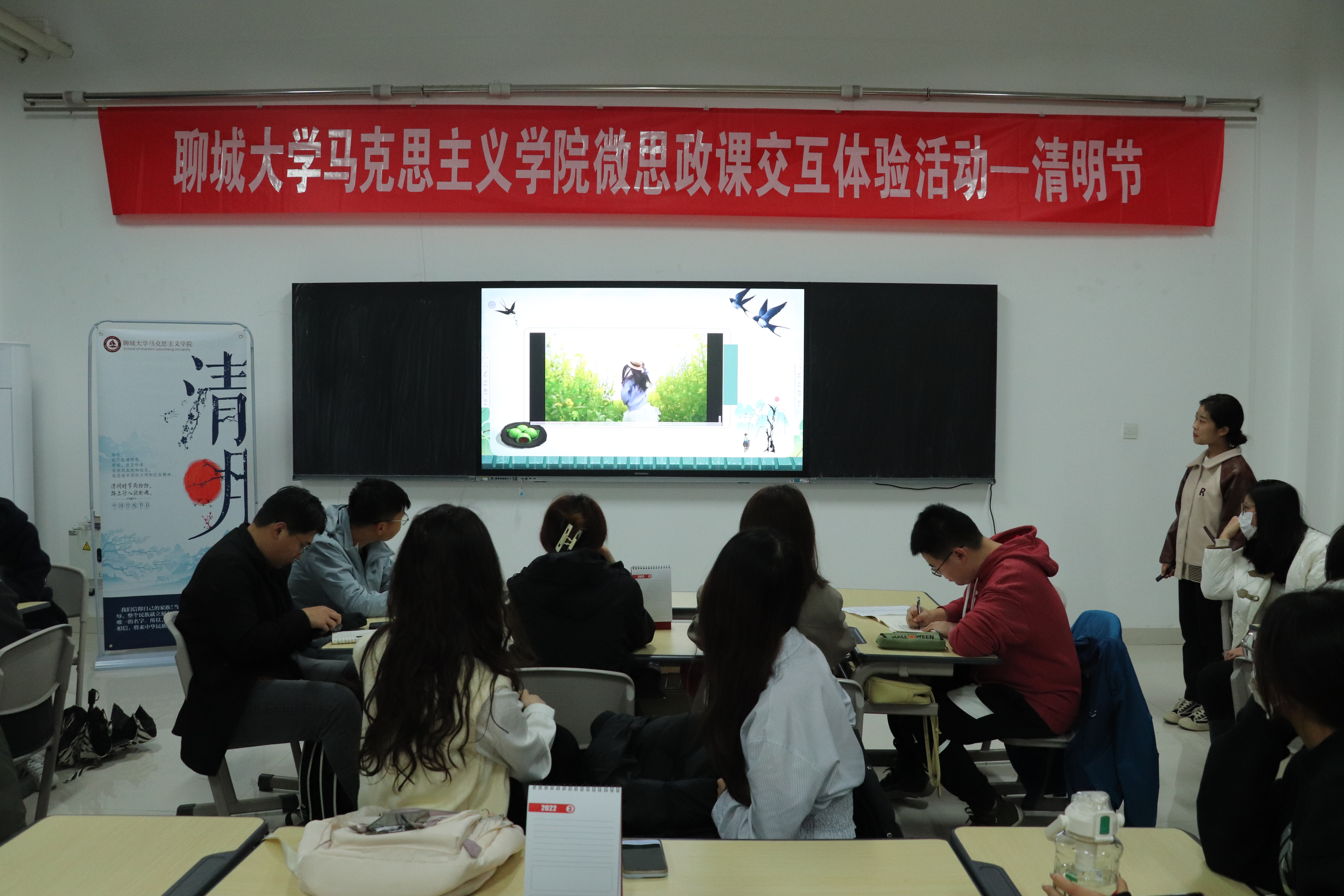 张龙腾以“铭记光辉历史、缅怀革命先烈,弘扬英烈精神、传承红色基因”为主题,深度结合专业特色,从清明节的来源、谈谈你了解的革命先烈和学习革命先烈精神三部分详细阐述了清明节的相关知识及其所蕴含的文化内涵与道德情怀。她从清明节的由来娓娓讲起,结合有关清明节的古诗和谚语,通过课堂互动使同学们深刻感受清明节所蕴含的中华优秀传统文化之美及其价值追求,进一步缅怀革命先烈,砥砺奋进脚步。她讲到,铭记是最好的敬仰,传承是最好的缅怀,我们要从革命先辈的伟大事迹中汲取奋进力量,锐意进取,勇挑重担,争做堪当民族复兴重任的新时代青年,以实际行动传承先辈的志向、使命和担当。
