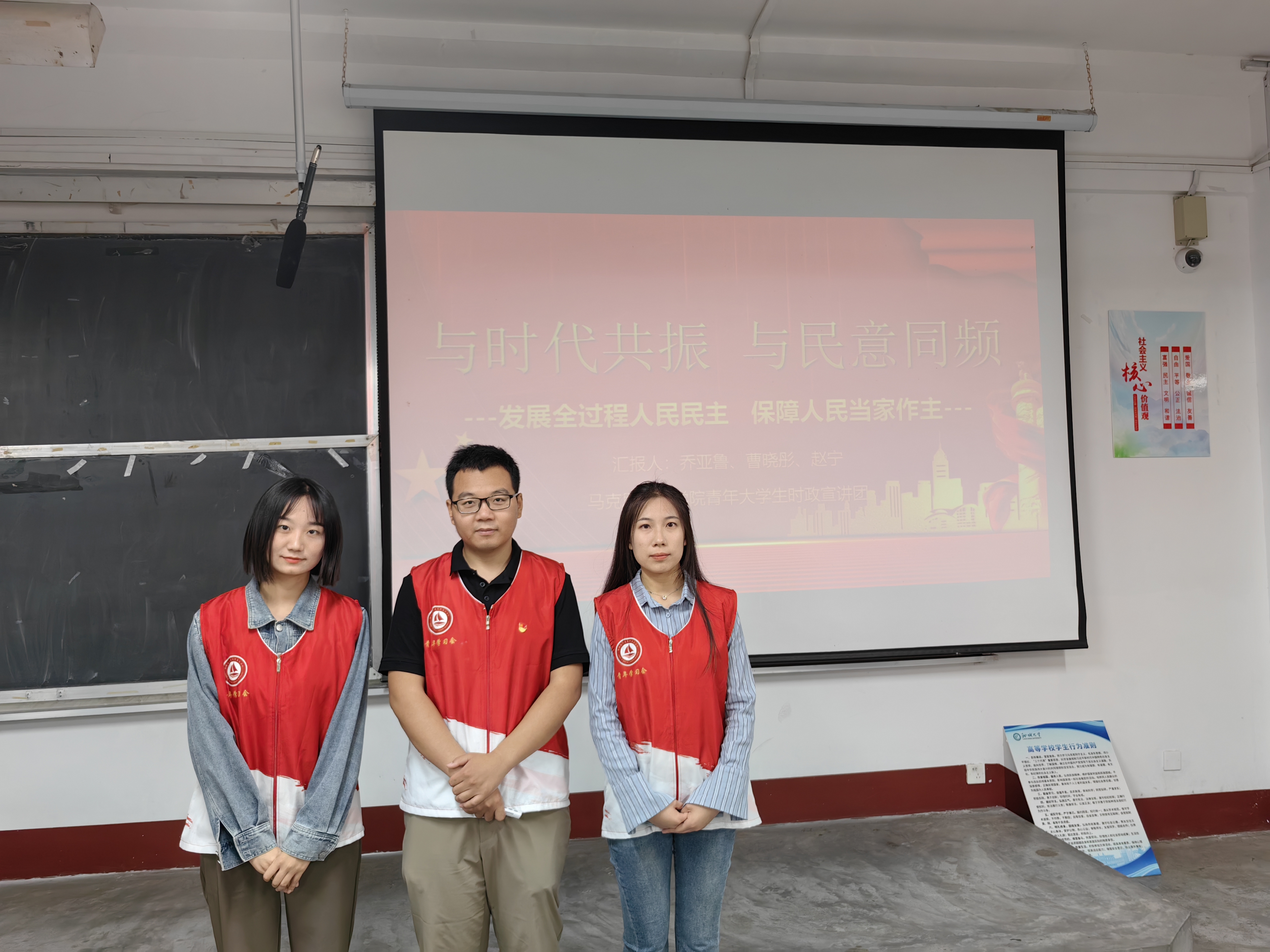 5月29日,我院青年大学生时政宣讲团成员乔亚鲁、曹晓彤、赵宁在东校区2号教学楼609室作了题为《与时代共振 与民意同频——发展全过程人民民主 保障人民当家作主》的宣讲。农学与农业工程学院青马班全体学员参加此次宣讲会。