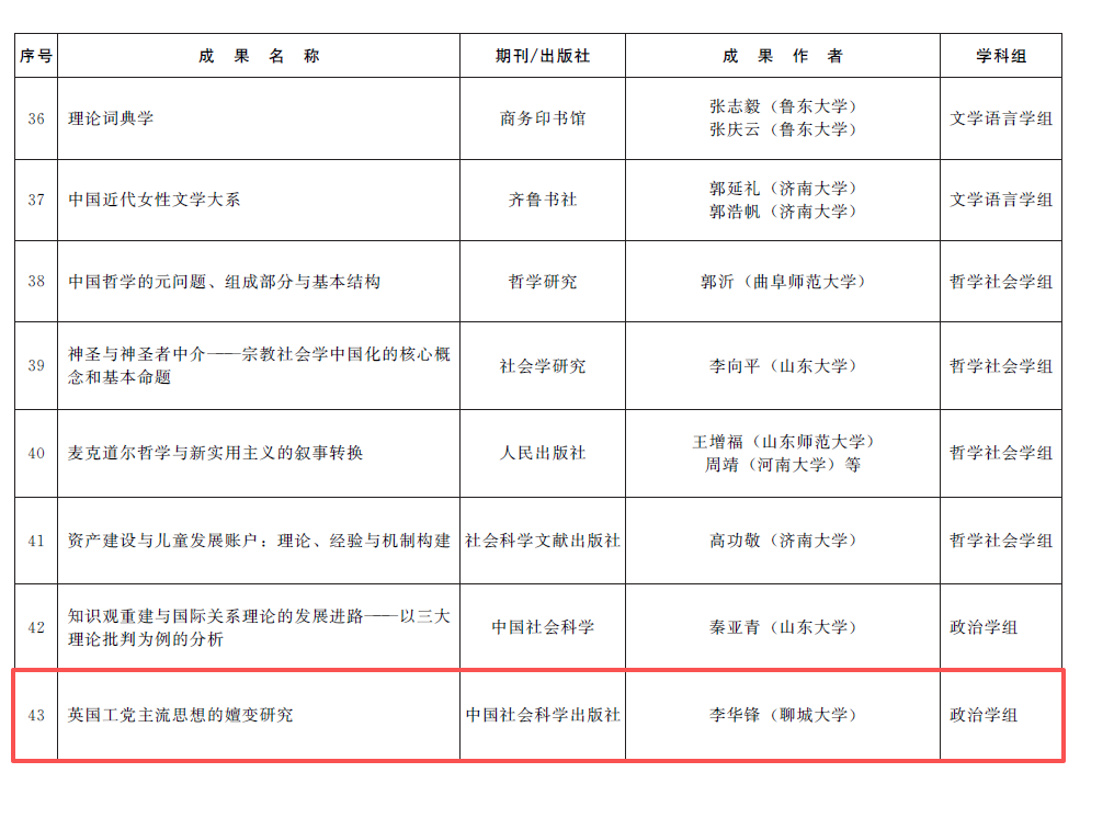 12月30日,山东省人民政府公布第三十七届社会科学优秀成果奖获奖项目名单。我院李华锋教授的著作《英国工党主流思想的嬗变研究》荣获山东省社会科学优秀成果奖一等奖,这也是我校在本届省社科优秀成果奖评选中获得的唯一一项一等奖。