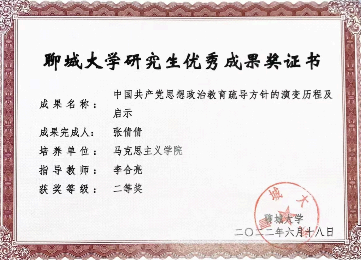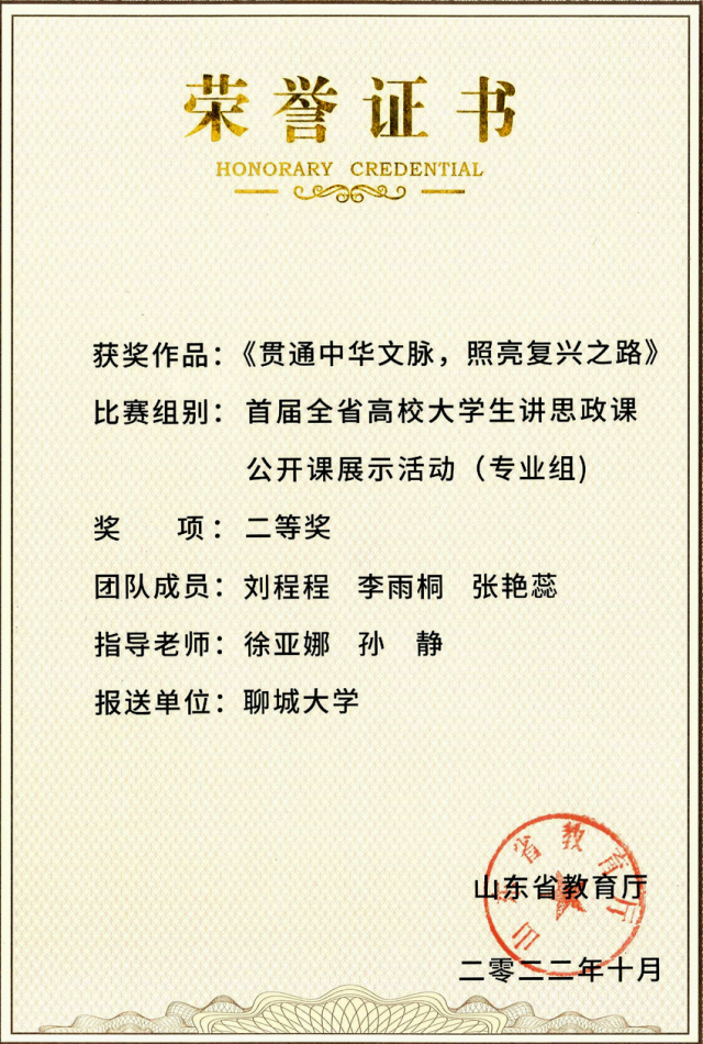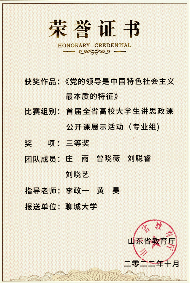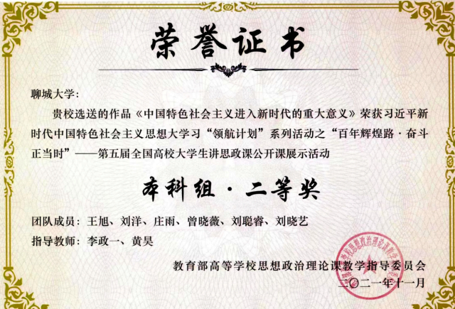 近年来,学生在第六届至第九届“华文杯”全国师范院校师范生教学技能大赛中获得特等奖14项、一等奖15项、二等奖8项、三等奖2项,累计获奖39项;获全国高校大学生讲思政课公开课展示活动二等奖1项、三等奖2项;获山东省师范类高校学生从业技能大赛一等奖8项、二等奖5项、三等奖7项;获得山东省第三届青年志愿服务项目大赛省级银奖,获得“挑战杯”大学生课外学术作品竞赛国家级三等奖1项,省级一等奖2项;获得省级先进班集体2个。
