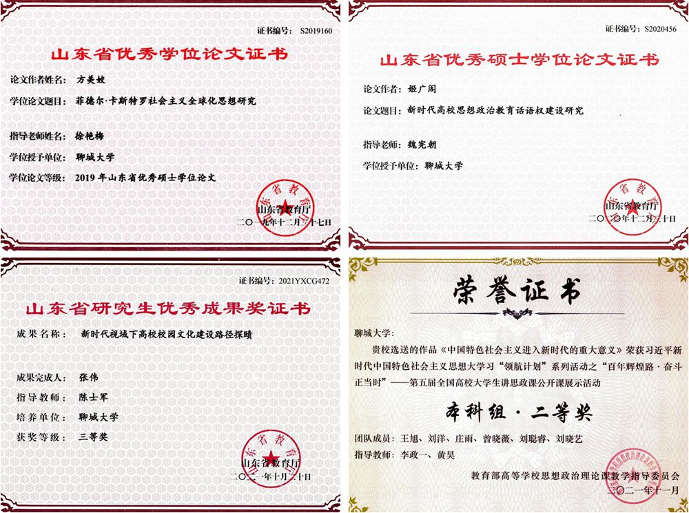 近年来,学院先后获批教育部专项教研课题5项,省级教学改革项目7项,校级教学改革项目11项;获山东省优秀教学成果二等奖3项,教育部多媒体课件大赛一等奖3项。获全国高校思想政治理论课教学展示活动一等奖1项、三等奖1项,获全国高校大学生讲思政课公开课展示活动二等奖1项,三等奖2项,获山东高校思想政治理论课教学比赛一二三等奖12项,在全国大学生各项竞赛中累积获得奖项三百余项。历年来,我院研究生获校级、省级研究生优秀硕士论文,研究生优秀成果奖,研究生教育质量提升计划项目等各级各类奖项数量众多。